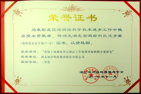 近日,湖北省测绘地理信息学会公布了“2016年度湖北省测绘科技进步奖”,其中由湖北地信集团和湖北省基础地理信息中心共同完成的“省级土地确权登记颁证工作底图坐标转换方案研究”获得“2016年度湖北省测绘科技进步二等奖”。