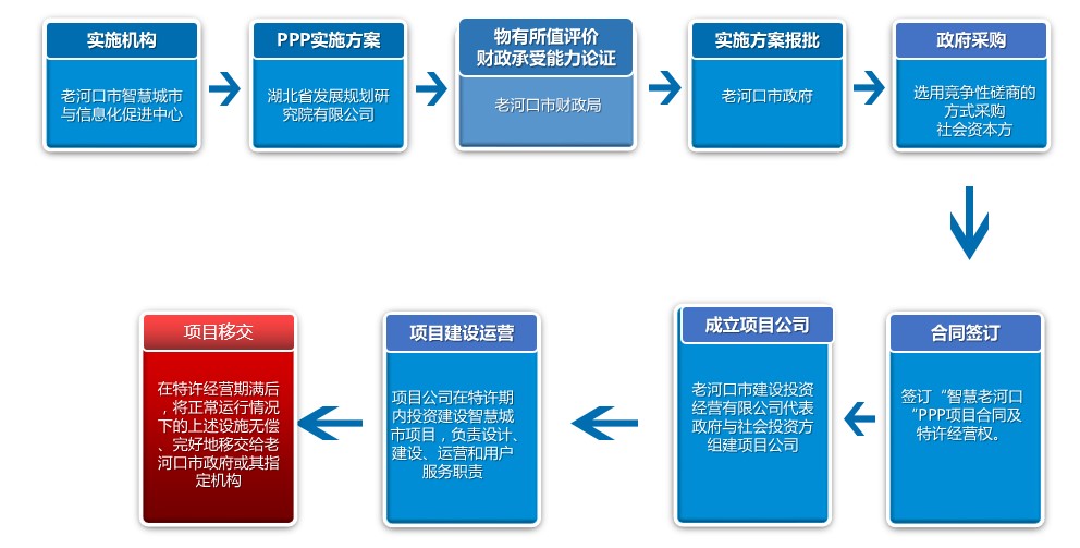 “智慧老河口”项目是“智慧老河口”一期已建项目和后期待建项目的打包运作。一期已建项目已经完工并在2016年4月通过专家组验收,初步建成了政务、民生和产业三大智慧应用体系,部署了政务资源目录服务系统、智慧城管、智慧社管、智慧规划、智慧应急、农博士微信平台、智慧儿童安全监护、平安校园、掌上老河口等应用系统,创新了管理模式,提升了社会治理能力和公共服务水平,有力地促进了社会治理科学化、公共服务便捷化、产业发展信息化、城市管理智慧化,充分发挥了智慧老河口的服务功能。
